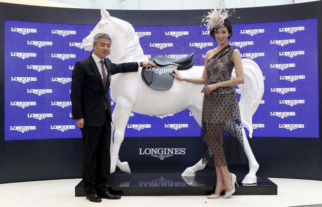 ▲ 浪琴表中国区副总裁李力先生与优雅形象大使林志玲在骏马雕塑前留影