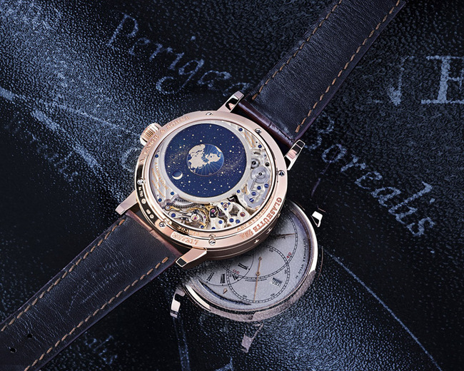 在Andreas Cellarius的着名星图《和谐大宇宙》(Harmonia Macrocosmica)前,展示了五款具备月相显示的手表。「蓝月」(Blue moon)是指在特定日历月中出现的第二次满月,这个罕见现象平均每隔两年半发生一次。为简化起见,大部分机械月相显示会将两个新月之间的时间缩短至29.5天,较实际时间少44分3秒,这些显示因此必须在「蓝色月亮」出现时校正一天。