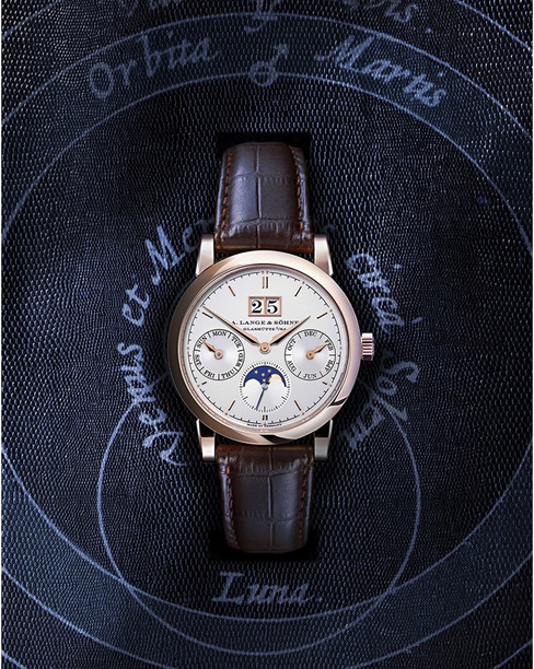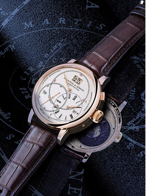 朗格表厂自1994年起成功研发出15款搭配月相显示的机芯。现有系列的其中五款高精确度手表配备了这项装置和其它复杂功能,并特意在迷人的星图《和谐大宇宙》前进行拍摄。这幅星图由生于德国的荷兰数学家和地图学家Andreas Cellarius在1660年绘制而成。此背景凸显出天文学和制表学之间的密切关系,表匠在打造具天文复杂装置的手表时,均极力模仿天体运转的实际形态,力求准确。