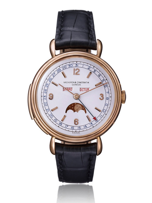 年份:1957 年 18K玫瑰金材质,叁问报时功能,配备日期和月相显示。 打磨细致的银质面盘搭配金质阿拉伯数字和棒状时标。