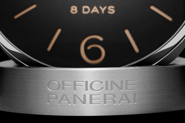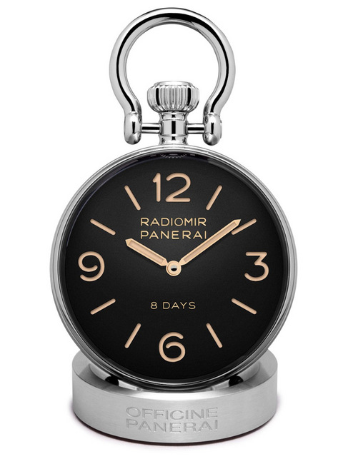 全新沛纳海座鐘以品牌经典面盘为设计重心,展现机械鐘表工艺史上最为人熟悉的经典元素,简约的设计以棒状时标衬托位于四个基本方位的特大数字,加上鐘盘整体的精简结构,令座鐘清晰易读。 自1930年代起,沛纳海即採用双层面盘设计,中间包覆夜光涂层,让萤光透过上方面盘的鏤空时标放射光芒。如此巧妙设计,令鐘盘色差更强烈,即使在昏暗环境下仍保持清晰可读,完美体现经典设计的现代巧思。鐘盘藏于球状矿石玻璃下,利用弧形镜面制造放大效果,让人细意欣赏復古设计的每个细节,包括以精工鐫刻于鐘盘上的「Radiomir Panerai」及「8 Days」字样。