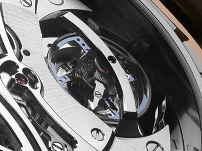 零件仅0.18克的30秒陀飞轮以极轻的硅和鈦金属制成,近看还能发现有挖孔减重,也因其质轻、耐磨的特性,故能实现36,000转的高震频。