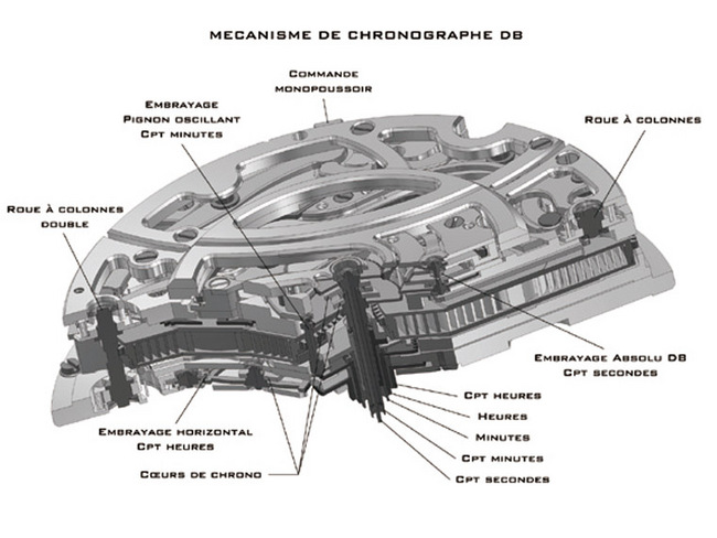 DB29歷时7年研发,搭载的DB2039手上鍊机芯由于走时加上计时共有5根同轴的中央指针,为了减少摩擦(尤其是啟动计时功能时),因此品牌一口气使用了DB专利的离合器控制计秒、垂直离合控制计分、水平离合控制计时,3种不同类型的计时系统搭配3个导柱轮。