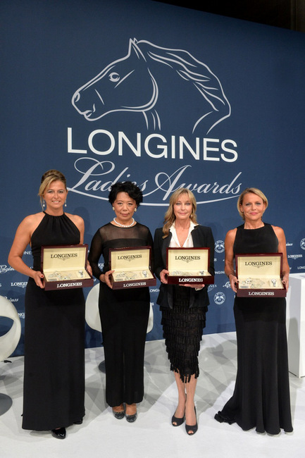▲ 荣获LONGINES Ladies Awards 2014四位得奖者:Criquette Head-Maarek的领奖代表Patricia Laffon-Parias 、Jing Li、Bo Derek及 Sylvie Robert。 (左至右)