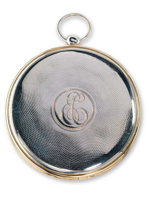 银质表壳带黄金外缘,底盖带手工鐫刻图案及中心EC装饰图案, 珐琅面盘,红宝石柱轮擒纵机构。 直径62毫米。于在8年热月28日(1800年8月16日)售予Candot大使。