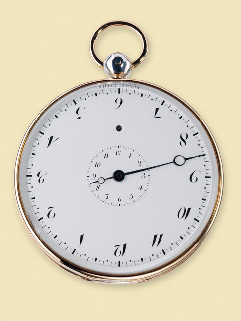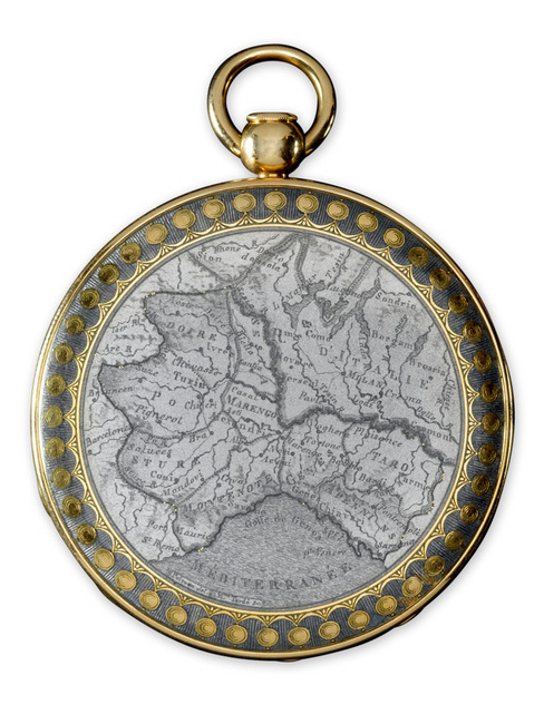 金质猎用表壳,镀银底盖饰以手工鐫刻的九个义大利行政区域地图,银质手工鐫刻面盘,3个偏心面盘显示为秒、星期及日期,温度计,红宝石柱轮擒纵机构,直径 50毫米。于1811年6月28日以4,800 法郎售予卡米尔.贝佳斯王子。
