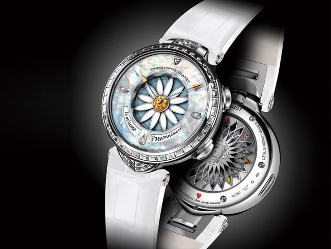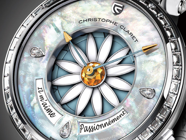 现代的高级女表需要宝石美钻点缀质感,还需要复杂功能追加内涵,但一只真正的女表除 了上述都要备齐,CHRISTOPHE CLARET还抓住了女性对爱情的嚮往、期待、曖昧、不安⋯⋯。2014年品牌的第一只女表Margot以情侣採摘雏菊花瓣来「解读」对方对自己爱意深度的这个小游戏为发想,随着花瓣飘落一边默数着:他爱我、他不爱我⋯⋯,这道经典难题的占卜游戏呈现在Margot女表上,每个回合进行的不仅是一场游戏,且无疑都牵动着一颗悬着的心。