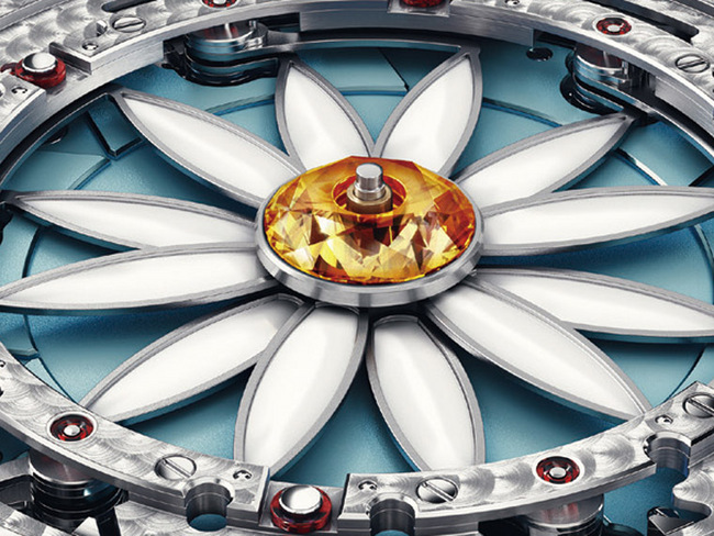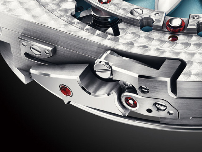 奇妙的花瓣消失机制乃是以藏在面盘外侧的数支支架瞬间收回花瓣,由于收回和最后復位的作动都非常快,花瓣为极轻的鈦材质,以减低动力输出的负担。