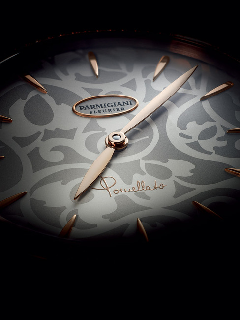 手表通常被定性为扁平的、不透明的。想要在手表上也体现这种涡旋式的「蔓藤」花纹并复现精致的明暗交映效果——即明暗对照(chiaroscuro)效果,能够达成这种细致入微差别效果的介质只有面盘。PARMIGIANI的专业面盘制造厂Quadrance et Habillage通过两个独立的处理步骤,採用了一种名为「防护」(épargnage)的表面防护涂层工艺,成功复现了这种「阿拉伯蔓藤」图案。首先,对整个面盘的表面进行高亮度乳白化处理。第二步,在乳白色表面上叠加丝网印刷的贴纸,这些贴纸呈现出阿拉伯涡旋蔓藤的图案。接着进行二次喷砂处理,这次处理包括了贴纸没有覆盖到的所有表面。以上过程结束后,贴纸所「防护」的区域呈现乳白色(正如工艺名称所示),而二次处理过程使其餘表面呈现喷砂效果。感谢Quadrance et Habillage巧夺天工的制作,最后得到的阿拉伯蔓藤花纹异常光滑,却又熠熠生辉,光线灵动交映,堪媲美宝曼兰朵通过叠加黄金与宝石所营造的真实珠宝效果。