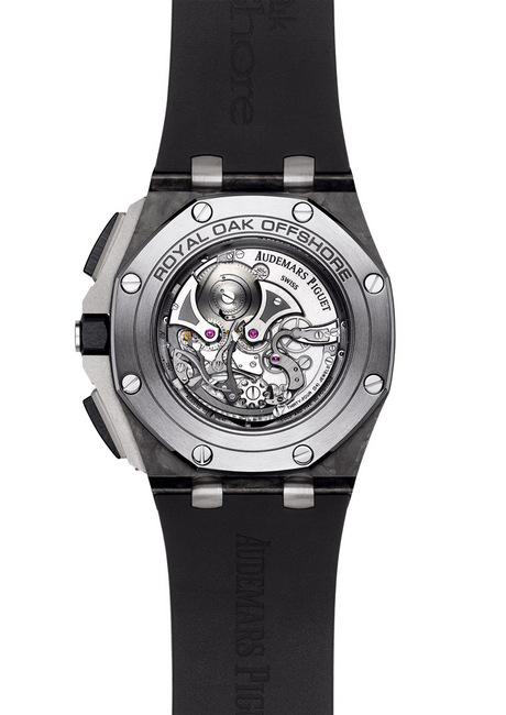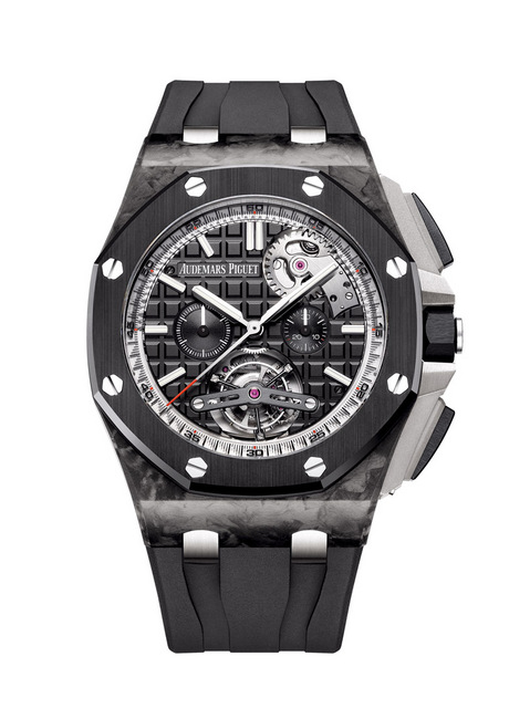 表环以锻造碳制作,轻盈的锻造碳原本被用于先进的高科技航天工业,爱彼时计于2007年率先在Royal Oak Offshore爱彼皇家橡树离岸型手表上啟用这一创新材料。 按钮採用陶瓷及鈦金属材质,并以四颗外露的螺丝固定在独立于表壳的鈦材质护桥上。 对于该系列的爱好者而言,此款Royal Oak Offshore爱彼皇家橡树离岸型自动上鍊陀飞轮计时码表的面盘设计也极为经典,饰有独特的「Méga Tapisserie」超大格纹装饰,同时完美衬托设在6时位置的陀飞轮装置。