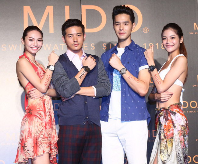 ▲ 丁春诚与宥胜同台出席MIDO记者会,宥胜演绎MIDO先锋系列台湾限量两地时区手表,丁春诚演绎MIDO先锋系列潜水计时手表。