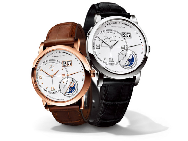 GRAND LANGE 1 Luna Mundi是朗格首款对装手表。两枚手表正确显示出北半球(18K白色黄金)和南半球(18K玫瑰金)的月相位置。
