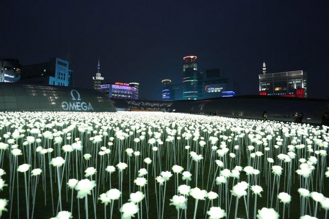 Dongdaemun Design Plaza, DDP 是由世界知名的建筑师Zaha Hadid所设计,自今年初开幕以来,已成为亚洲最知名的文化活动场所,其座落于首尔歷史区域东大门的中央位置。东大门设计广场精心地妆点了花卉与蝴蝶主题-事实上,通往建筑物的通道两侧展示了超过21,000朵白色鲜花,且每朵鲜花皆装设一个底座,并利用小型灯光从内部点亮花朵。