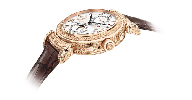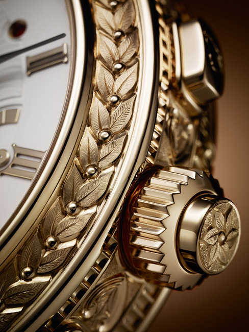 超级复杂功能一词用于指称兼有数种高度精密的复杂功能的机芯。以此类推,那些需要精于设计、制造和装饰的大师级工匠发挥无限创意而打造的手表表壳自然可称得上是超级复杂表壳。相比其他表壳,大师弦音手表的表壳更是当之无愧。单单开发表壳就耗时四年,而最终结果便是这款圆形双面手表,两面同样繁复精美,可双面佩戴,从而淋漓尽致地展现面盘之美。该款表壳的祕密就在特别设计的表耳以及独具匠心的反转装置,不仅操作简便,而且反转之后可以牢牢固定。在大师弦音手表中,表壳工匠的非凡技能,加上大师级雕刻师耗费数百小时的装饰处理,令整个表壳更显高贵迷人。雕刻师需要在玫瑰金表壳上雕饰代表周年纪念的月桂花环浮雕图案,并在表壳侧边上雕刻与功能操作相关的铭文和符号,确保用户即使手边没有说明手册,也能轻鬆操作这枚复杂功能时计。月桂花环代表着胜利,自古以来就用于点缀在胜利者和王者的头顶。对于百达翡丽而言,这些花环图案专为纪念品牌成立175周年的七枚大师弦音手表而生。