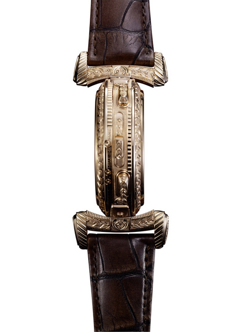 ▲ 圆形表壳,12至6点鐘位置的枢轴具有独家专利反转装置,18K玫瑰金材质,214枚零件,双面蓝宝石水晶玻璃镜盖,防尘防潮,不防水表圈、表壳侧边和表耳均手工雕刻月桂花环浮雕图案,表壳侧边和按钮上刻有不同功能的铭文和符号