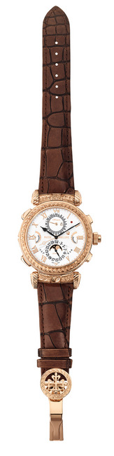 此外,大师弦音手表(Grandmaster Chime)是百达翡丽首款不分正反面的双面手表,即两面均可朝上佩戴:一面为时间显示和自鸣功能,另一面则专门显示瞬跳万年历。这得益于该款时计表耳中採用的巧妙反转装置,令翻转表面非常简便。反转操作出人意料的简单,而表壳也能轻鬆卡入所选位置牢牢固定。而且,时间和日期显示,作为手表最常用的功能,在两面均有呈现。大师弦音手表还配备了诸多智能装置,可杜绝意外发生的不当操作。保护精密复杂、包含诸多微型零件的机械机芯,从而保证了该款时计无与伦比的简单易用、安全可靠。