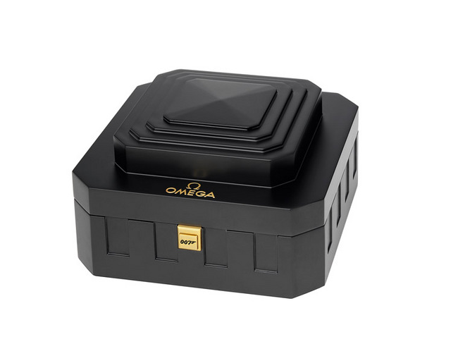 ▲ 这款无与伦比的18K 黄金欧米茄Seamaster Aqua Terra 手表欢庆金手指50週年纪念,搭配了特别的展示盒;外盒设计灵感来自于美国诺克斯堡的美国金库(U.S. Bullion Depository)建筑物。