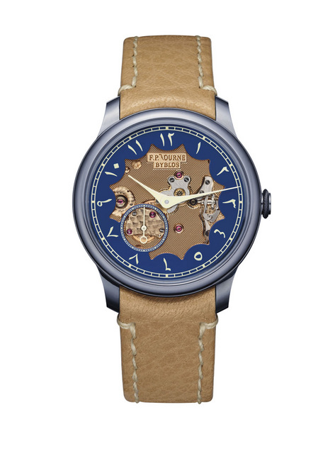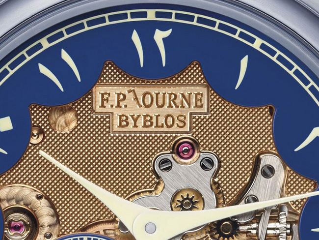 Chronomètre Bleu Byblos是用作慈善拍卖的手表是F.P. JOURNE的全新作品,是品牌为庆祝全球第十家专门店于贝鲁特开业而创制的。它以「Byblos」这个饶富神话色彩的城市为名。Byblos也就是比布鲁斯,一个座落黎巴嫩海岸、贝鲁特以北的城市。Chronomètre Bleu BYBLOS是F.P. JOURNE首次採用开放式面盘设计的作品,通过时计的正面来展示18K玫瑰金机芯的美丽造工,并于蓝色小时环上设有阿拉伯数字时符,让Chronomètre Bleu BYBLOS看来就像是东方的太阳照耀在地中海的蔚蓝天空上。这枚腕表的另一独特设计是将F.P. JOURNE的标誌直接雕刻 在机芯上,其中「J」更以腓尼基字母的形象来刻制──这个代表腓尼基语中一个名叫「yodh」的字母,意思是「手」,象徵着F.P. JOURNE的腕表作品对手工艺的重视;而「yodh」的数值是十,是字母表中的第十个字母,用来代表F.P. JOURNE全球第十家专门店便最好不过了Chronomètre Bleu Byblos仅限量发行99枚,是次拍品亦是其中一枚,并以东阿拉伯 语为小时数字设计。