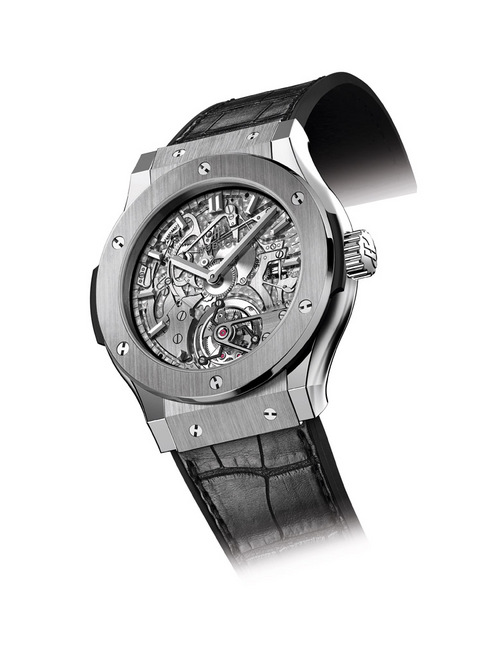 ▲ HUBLOT Classic Fusion Cathedral Tourbillon Minute Repeater经典融合大教堂叁问陀飞轮手表拥有美观的45mm直径,华丽而红润的视觉效果源自宇舶表生产的King Gold(含有5%铂金的合金材质),此次也一併推出鈦金属款式,最后,鱷鱼皮橡胶表带和折叠式表扣无不彰显其舒适性,灵活性和耐用性。鈦金属款,限量99只。