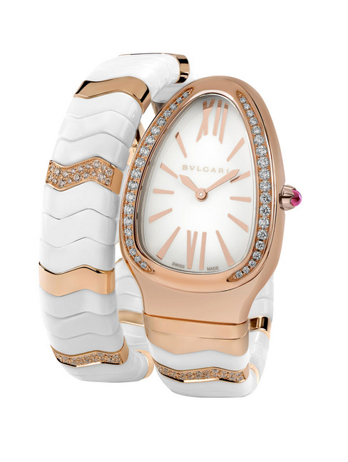 除异材质的衝突美学外,Serpenti Spiga 系列更结合女性表款的工艺极致。搭载瑞士制石英机芯,Serpenti Spiga 在玫瑰金或拋光精钢 35mm 表壳中精准走时。Serpenti Spiga 表冠精镶粉红碧璽,为表款增添一抹宝格丽经典风情,以珠宝妆点尊贵蛇头。推出精钢搭配白色陶瓷、精钢与黑色陶瓷搭配钻镶、玫瑰金与白色陶瓷搭配钻镶、以及黑色陶瓷与钻镶搭配玫瑰金的双圈表带款,Serpenti Spiga 系列各个表款皆拥有独一无二的震撼魅力。白色或黑漆面盘成为指针走时的完美背景,时标则选用大器的罗马数字符号。
