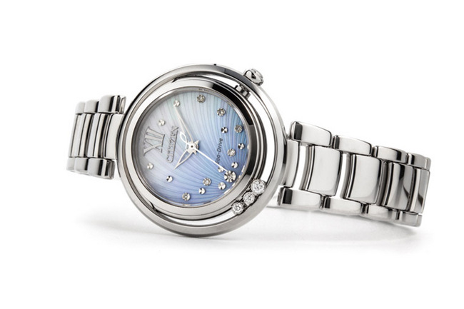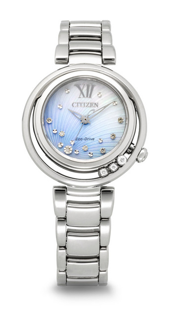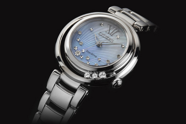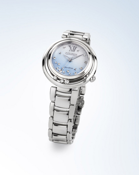 ▲CITIZEN光动能钻石女表晶亮的钻石衬在白蝶贝面板之上,流露出一股清新的自然之美。
