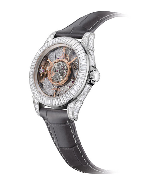 ▲ 459颗钻石将OMEGA碟飞中置陀飞轮手表装饰得更绚丽辉煌,此款精致时计仅发行叁只且仅在欧米茄名品店贩售。