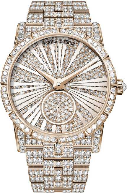 另一款Excalibur36全钻手表,则以金色耀眼的风貌,让人不禁联想到圣诞树上的奢华金色彩球掛饰。同样源自Excalibur系列的这款手表,以尺寸略小的姿态散发出璀璨光辉,穠纤合度的身型,贴合手腕的设计,适合较为娇小的男仕或女性佩戴。Excalibur36全钻手表以温润的玫瑰金打造,最为傲人之处莫过于表壳、表耳、面盘、鍊带,以至于表扣,皆镶满了无比耀眼的华丽美钻,贵气逼人。此外,就连指针也以玫瑰金呈现,除了时、分指针之外,位于6点鐘位置还有小秒盘,时时刻刻地精准运转,而这一切得归功于ROGER DUBUIS引以为傲的小尺寸自动上鍊机芯RD821。