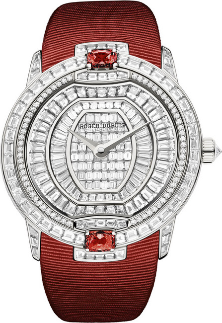 Velvet高级珠宝表手表亦搭载小尺寸的RD 821自动上鍊机芯,由172枚零件组成,拥有48小时动力储存,在各个零件细节上的打磨修饰格外用心,方能符合日内瓦印记的严苛要求。而红宝石辅以红色绢质表带,可谓相得益彰,由内而外皆散发出华美气质。此表款乃高级订制表款式,仅于专卖店发行,今年12月,全台第一家ROGER DUBUIS专卖店将于台北101购物中心开幕,仕女名媛未来将有机会近距离欣赏其迷人身影。
