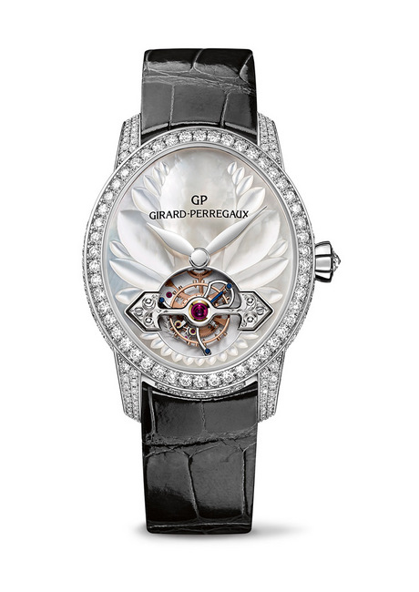 ▲ 猫眼系列金桥陀飞轮手表, 白金表壳,天然白色珍珠母贝鏤雕面盘优雅细致。
