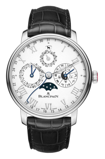 自动上鍊Calibre 3638机芯,仅有434个零件却可维持7日动力储存功能。小时、分鐘与西历皆显示于中央。位于12点鐘位置的计分盘指出间隔两小时的数字时标与符号; 3 点鐘位置的计分盘则显示五行元素与地支。中国历法的月份,日期(30日週期)与闰月显示位于 9 点鐘位置,而12点鐘位置视窗则显示该年的生肖图样;月相显示则位于6点鐘位置。 直径 45 mm的铂金表壳嵌入原石切割红宝石表冠,沿袭Villeret系列经典特色:双表圈设计表壳、大明火珐琅面盘搭配镀金表圈、烧制前手绘时标,鏤空柳叶型指针及蓝钢西历日期指针。中国传统历法表自2011年推出以来受到各界热烈讨论,而每一年限量20只推出的生肖铂金版更是手表喜爱者争相蒐藏的梦幻逸品。全台专卖店独家羊年款即日起在台北101 BLANCPAIN专卖店开放预约鑑赏。