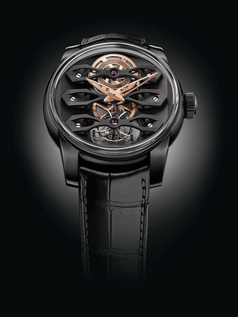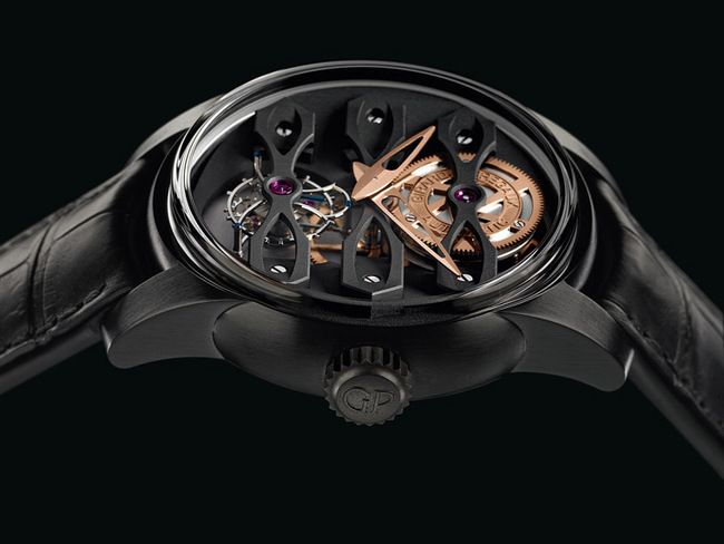 ▲ GP芝柏表全新叁桥陀飞轮手表以DLC镀膜鈦金属打造表壳,并搭载 GP芝柏表 GP09400-0002自动上链机械机芯。