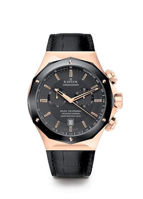 ▲ Delfin 计时码表搭载 EDOX 10机芯,黑色外圈「水上冠军」雕刻