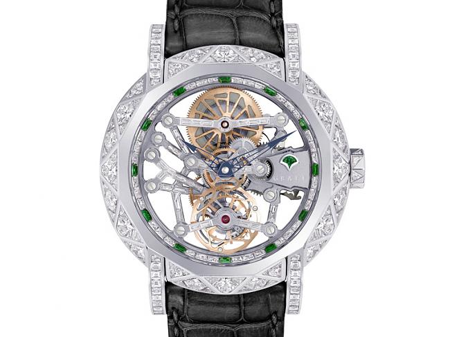格拉夫奢华手表在2015年迎来另一枚开创先河的瑰丽名表。Diamond MasterGRAFF Structural Tourbillon Skeleton手表搭载GRAFF Calibre 6机芯,这一枚独家研创的全新手动上鍊机芯由鏤空陀飞轮推动,巧夺天工。夺目的46毫米表壳上以格拉夫的专利隐形马赛克镶嵌技术镶满顶级美钻,更在每一条桥柱上饰以闪烁钻石,写下业界的新标准。线条立体分明的无钻款式採用24个鏤空琢面设计,手表的内部运作一览无遗,展现别树一帜的魅力。