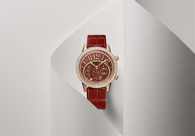 今年是JAEGER-LECOULTRE积家向天文学致敬之年,全新推出的多款SIHH手表採用深浅不一的蓝色,令人联想到浩瀚无垠的宇宙穹苍。星象观测被视为最古老的科学,一直以太阳为主要观测对象。太阳在40亿年前诞生,在漫长的演变过程中散发出愈加耀眼的光芒。这颗硕大炽热的恆星啟发了大工坊的创作灵感,由此积家设计出炫目似火的全新Rendez-Vous Celestial约会系列星空手表。面盘由紫红色砂金石打造而成,色泽浓烈鲜艳,佈满闪烁金色光芒的微小颗粒,摄人心魄。