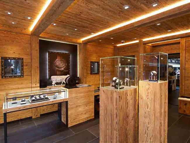 策马特小镇因坐拥世界传奇名峰而拥有举足轻重的地位,今年正好为人类首度攀登上马特洪峰山顶的150週年纪念, HUBLOT 选在此地设立全球第80间融合传统与现代风格、焕然一新的品牌专卖店更显意义非凡。策马特小镇,地名意味「高山中的草原」。HUBLOT 宇舶表以瑞士特有木屋风格打造专卖店,象徵此区域的人文传统与歷史。传统建筑以现代化设计的外观呈现,店内使用木头与玻璃制成的柜檯与展示空间。设计灵感来自穀仓的木头纹路墙壁搭配裸露梁柱嵌灯装饰,增添如「家」一般的温馨感。墙上掛满用金属相框装饰的瑞士剪纸艺术,同时描绘出游牧迁徙歷史的图腾在橱窗和阳台展示。HUBLOT 宇舶表认为融入品牌精神的同时,强调当地特色传统文化亦十分重要。