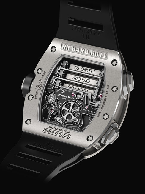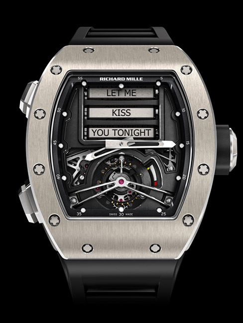 情色手表在制表史上早已有跡可循。过去的设计师以机械手法重新打造暗示性的场景,藉此消遣放荡主题。由于抵触了道德、宗教与政治权力机关的保守风俗,所以,这些作品经常遭到被禁止与扣押的命运。然而,就像所有禁忌关系一样,避人耳目乃享受欢愉之道,正因如此,今天我们才得以领略这项暗藏于部分型号裡的复杂功能。然而,RM 69 手表却背道而驰,它以字句清楚地表达爱和慾。本设计完全不以自动装置造景,而是巧妙运用激情、感官,甚至爱欲渴望的坦率表达。
