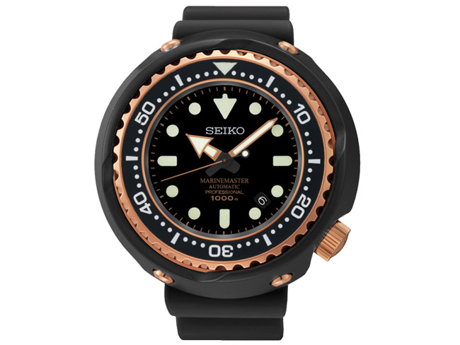 Baselworld全新潜水表款SBDX014G搭载8L35机械机芯,衬托玫瑰金色、黑色硬质涂层与金属陶瓷外壳保护圈,SEIKO专利研发的超强韧硅胶表带,建议售价为NT0,000。