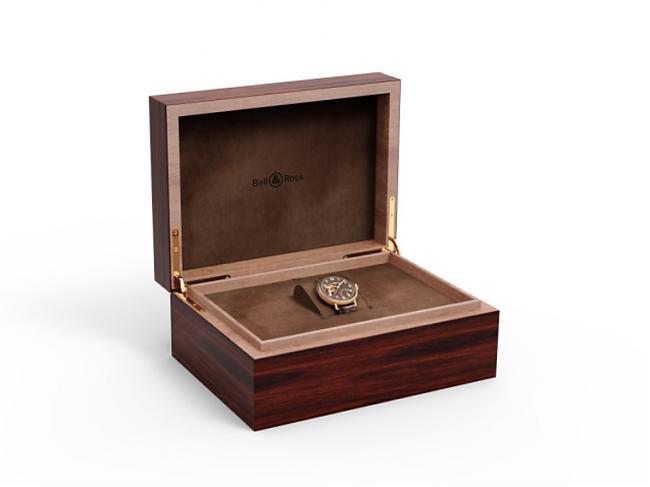 在手表背面,透明的蓝宝石水晶玻璃表底盖同样展现出机械之美,尤其是四分之叁主夹板和平衡摆轮的板桥。Bell & Ross选择使用孟加锡 (Makassar) 黑檀木制作表盒,加入加湿器和湿度计后还可作为保湿雪茄盒。这个雪茄盒的内部採用珍贵罕见的卡亚木,可以放置多达50根雪茄。对雪茄迷而言,十分具有吸引力!