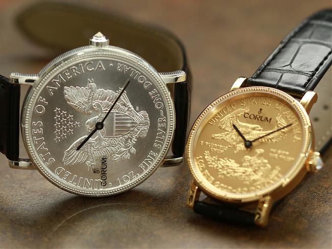 近半世纪以来,钱币手表制作方法始终如一,走进钱币手表的第50个年头,CORUM特以2014年铸造的50元双鹰金币及1元双鹰银币制作两款限量版手表,这两款钱币从未公开流通,饰以出现在古老20元双鹰钱币、象徵自由的美国飞鹰、自由女神、象徵和平的橄欖树干等图案;两款纪念版尺寸延续CORUM传统,黄金型号直径36毫米,纯银型号直径43毫米,两者的表冠同样镶一颗钻石。