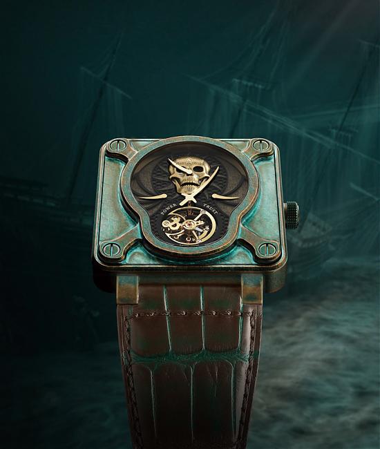BELL & ROSS以海盗Bartholomew Hawkins 的传奇故事为灵感,于立体蜂巢状面盘 上使用手工雕刻的黄金骷髏头装饰,指针则制作成长剑及匕首的样貌,呼应海盗的 传奇故事。手表表壳採用铜锡合金制作,其中铜佔 92%、锡佔 8%,色泽独特。铜 受到温度、湿度及摩擦等环境因素会出现变化,呈现出陈旧气质。