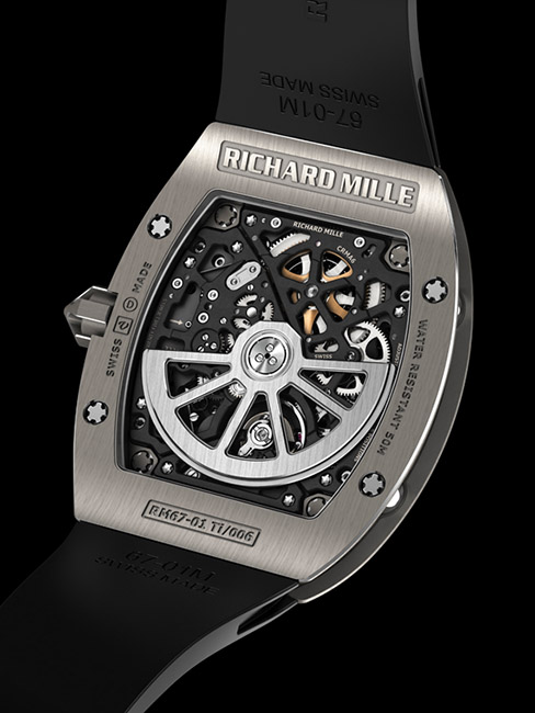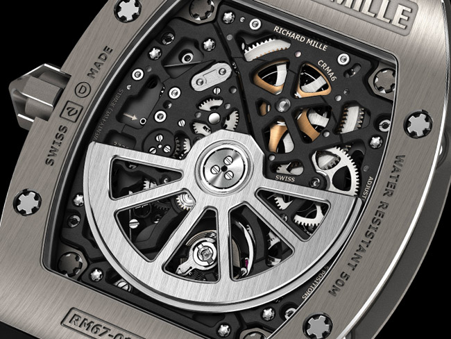 为 RM 67-01 手表所打造的CRMA6自动上鍊机芯,是厚度仅3.6毫米的崭新机芯,由 Les Breuleux 的工程师自行设计。机芯底板和桥板均以五级鈦合金制成,结合灰色与黑色电浆处理作为精工修饰,搭配铂金自动盘摆锤。机芯底盖延续创造深邃感的格外用心,大规模的鏤空效果随处映入眼帘,诸如高度鏤空的上鍊发条盒、自动盘、传动轮系与自动上鍊装置桥板。机芯的建筑结构足以加载机械传奇;甚至是面盘侧的叁枚一字槽螺丝,也隐喻制表商反传统思路之道而行的精神,而定制力矩螺丝(可通过机芯鑑赏)的广泛运用,确保其根据功能与使用的正确张力得以准确与适得其所地应用。