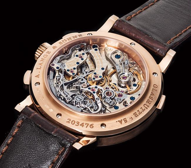 表背大方展现德式特色的鹅颈式微调,下方夹板亦拥有精美雕饰,平衡摆轮、导柱轮乃至计时码表轮系等部件都经过精密打磨、倒角处理,一派富丽堂皇。