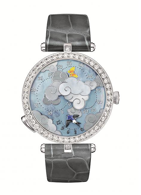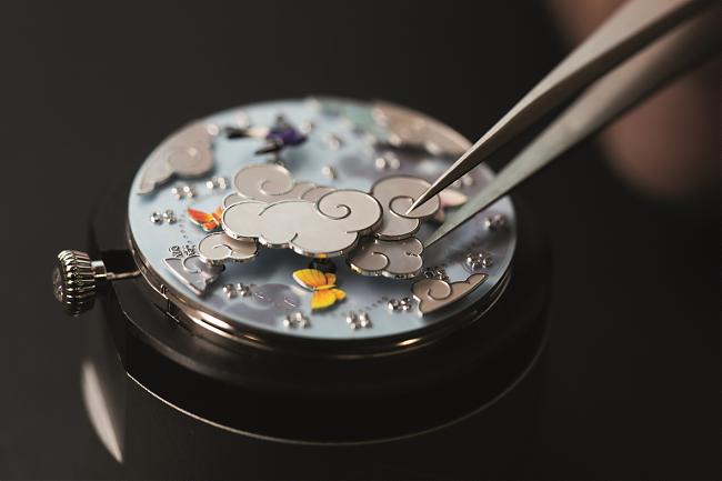 为演绎面盘上细致的自然场景,梵克雅宝融合不同工艺,让面盘各个部分展现浑然和谐的美感。绽放柔和光芒的天空是以珍珠母贝打造,再以手绘工艺描画蓝天色彩。起伏有致的浮云以不同深浅调的灰色珍珠母贝妆点,在云间起舞的蝴蝶和燕子则以微型彩绘添上夺目色彩。