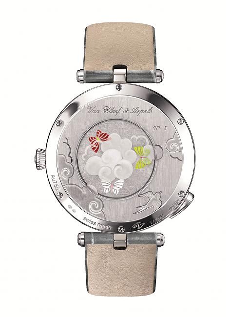 底盖借鑑多重工艺,如以鏤刻工艺在金质底盖上鐫刻燕子在空中翱翔的美态,自动盘上亦饰有叁隻彩漆蝴蝶,蓝宝石水晶玻璃内层鐫刻精致浮云,令自动盘随机芯在手腕上旋转时,叁隻蝴蝶亦如同在彩云中翩翩起舞。