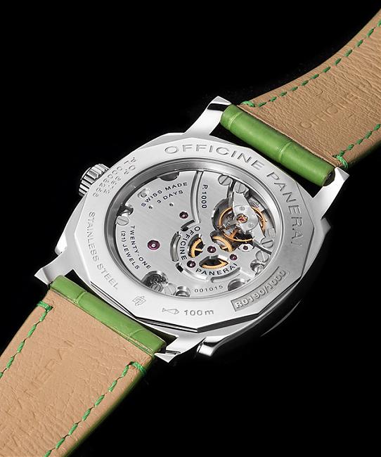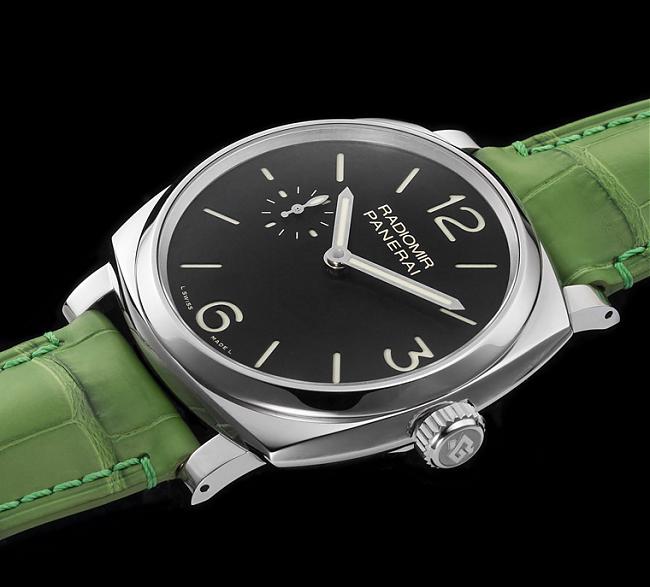 沛纳海在2015年亚洲鐘表与奇蹟表展不甘趋于平凡,不只是改款,还推出了P.1000全新自制机芯,经典的叁明治面盘、枕型表壳还搭配了清新、活泼的绿色表带,展现表款年轻活力的气质,不管男、女戴上都合适。