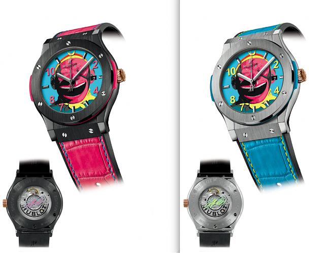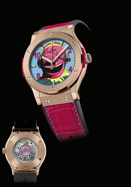 与中国艺术家岳敏君合作的HUBLOT首款生肖手表——经典融合系列大笑猴王手表,亮粉色面孔的孙悟空开怀大传达着勇往直前的乐观自信。12点鐘位置绘以紧箍咒的月牙立体造型,代表着孙悟空师徒西天取经得到正果;五个时标则以不规则的形式出现:4点鐘位置的时标则代表师徒四人,7点鐘位置和2点鐘位置的阿拉伯数字表示孙悟空七十二变,而10点鐘位置和8点鐘位置则象徵孙悟空师徒四人取经所走过的十万八千里路。