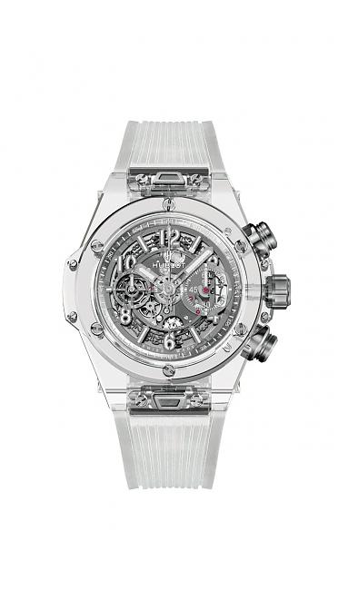 拋光蓝宝石水晶材质/HUB 1242 Unico自动上鍊机芯/时、分、小秒、日期显示/计时码表功能/透明拋光合成树脂鏤空面盘、透明拋光合成树脂表耳、透明硅胶与缎面拋光鈦金属表冠、透明结构表带/防水100米/表径45mm/限量500只/参考价:NT$ 1,925,000