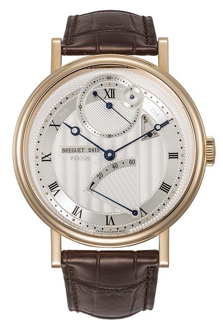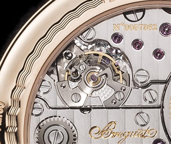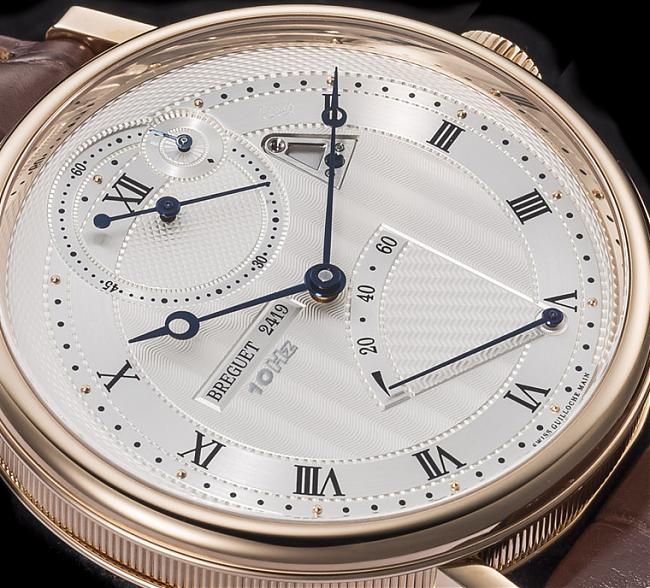 BREGUET宝璣的Ref. 7727推出当时可以说是同时期制表技术的巔峰;其实他们家在2010年就已经推出了同样是72,000vph的高震频计时码表3880,较晚问世的7727看起来只是相同技术的转用,甚至还少了计时功能,但实际上宝璣在7727中导入了更多3880未曾用上的技术,像是利用磁浮原理几近悬空的摆轮、或是上下双层的硅游丝等等,这些设计进一步地减少了高震频可能造成的零件磨耗并且再提升了精度,技术含量其实比3880高出相当多,虽然规格上的特徵相似,但要数7727才更能做为现代科技制表的象徵。表款在外观上一派宝璣式的古典,除了面盘上的10Hz字样之外,只有1点鐘附近的1/10秒闪电针有透露出一点高振频的线索,两点鐘的叁角形夹板则是摆轮的降落伞避震器和磁浮轴承穿过基板秀在表面;面盘的下半部是大面积的储能显示,以72,000vph的高震频来说能维持60小时的动力储存也相当不容易了。