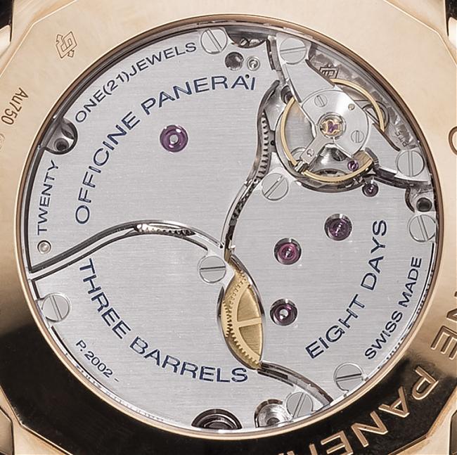 P. 2000系是沛纳海的自制机芯中唯一叁发条盒的系统,之后即便同样是八日鍊的5000系也只有双发条盒,夹板的分件从2000系以后也是愈来愈简单。