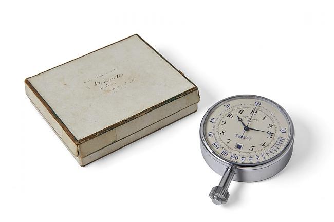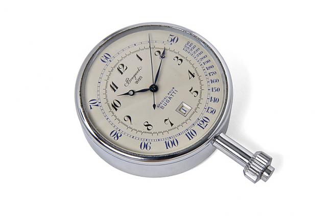 表壳由镀铬金属打造而成,直径67毫米,搭载专为汽车精心订制的复杂功能:测速尺规。奶油色面盘上鐫刻Spécial pour Bugatti(专为布加迪订制)字样,配有1783年宝璣创制的带鏤空偏心月形针尖蓝钢指针,6点位的开孔内设有一个累积分鐘计时器。此款计时码表由机械机芯提供动力,旋转位于6点位的表冠即可为其上鍊,动力储存长达8天。该时计珍品的原装表盒也在竞拍时被一同购入。